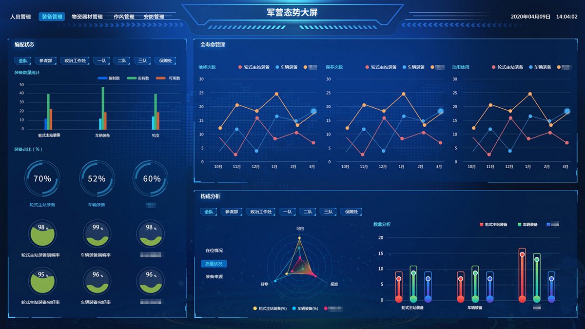 綜合保障系統(tǒng)依托物聯(lián)網(wǎng)、RFID識(shí)別和傳感技術(shù),著眼作戰(zhàn)精準(zhǔn)保障、戰(zhàn)備常態(tài)保障和官兵生活保障,對戰(zhàn)備物資、裝備器材、營房物資和被裝物資等的全生命周期的電子化管理,對官兵的健康實(shí)時(shí)監(jiān)護(hù)。包含財(cái)務(wù)管理、軍需油運(yùn)、武器裝備、衛(wèi)勤管理、營房管理模塊。確保部隊(duì)出動(dòng),車輛給養(yǎng)油料跟得上,裝備維護(hù)情況實(shí)時(shí)掌握,營房管理工作平時(shí)與戰(zhàn)備同步推進(jìn)。